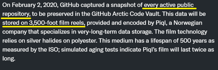 Arctic Code Vault Contributor를 인터넷에 검색해보니 GitHub Archive Program에 기여한 사람들한테 주는 뱃지인데, GitHub Archive Program는 인터넷 저장소가 사라졌을 때를 대비해 1,000년 이상 코드 사본을 필름에 인쇄해서 북극에 보관하는 것이란다.